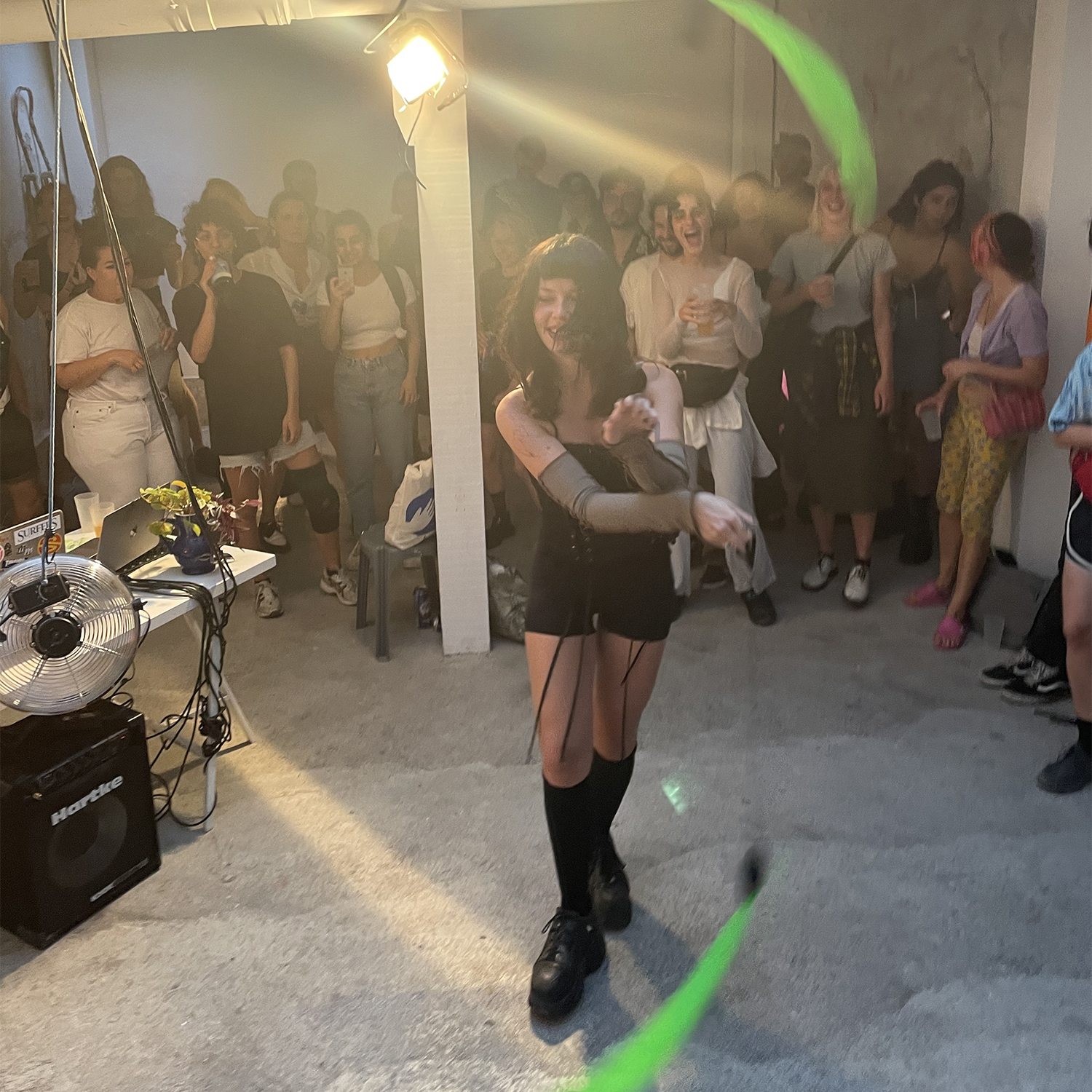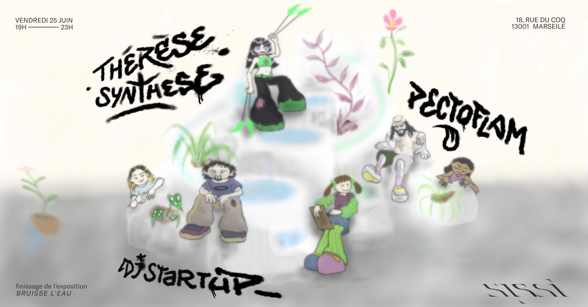 EN/ A party with great fanfare to celebrate the closing of the exhibition Bruisse l’eau, by Camille Bernard, at the Sissi Club gallery. It was the occasion for Dj Startup to present a mixtape entitled « team building boot camp » which was released on the label Carpaccio Cathedrale, represented here by the truculent Pectoflam. Everything started with a precious live, with the warm voice of the diva with the wedge shoes, Thérèse Synthèse.